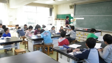 写真を見て分かるでしょうか。実は5年1組の担任の先生が5年3組の理科の授業で指導している様子です。これは来週に控えた世田谷区小学校教育研究会理科部の授業研究を1組の先生が3組の子どもを使って事前に指導させてもらっているからです。子どもたちにとってよりよい授業を目指して、研究を進めています。