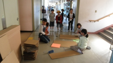 学習発表会には個人の作品だけでなく学年の共同制作作品も展示します。共同制作に取り組み始めた5年生の様子を1年生が珍しそうにながめていました。