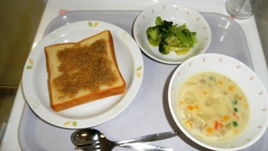 セサミトースト、クリームスープ、ブロッコリーサラダ、牛乳