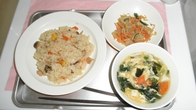 吹き寄せご飯、かきたま汁、ごま酢かけ、牛乳