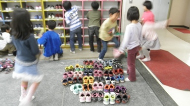 1年生が靴箱掃除で上手に靴をそろえていました。今では安心して協力しながら掃除をしています。