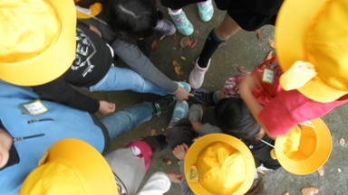 お昼休みに鉄棒の辺りに行くと、1年生がこおりおにをしていました。太陽が出ると、ぽかぽか暖かな天気でした。
