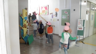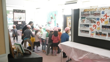 ピンク帽子の子どもたちは、わかな保育園の園児です。学習発表会に来てくれました。新校舎2階の総合学習室には自分たちの作品が飾られてあります。楽しんで見ていってくれました。