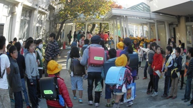 今週は3年3組と5年3組です。大勢の子どもたちが正門に集まり、あいさつをしています。