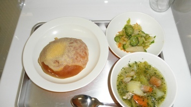 ビスキュイパン、ポトフ、野菜のイタリアンドレッシングかけ、牛乳