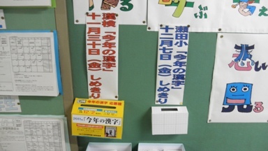 今日の朝会で今年の漢字の話をしました。一つは日本や世界の世相や社会を漢字一字で表す、もう一つは瀬田小の1年間を漢字一字で表すの2つです。校長室前に応募箱があります。今年はどんな漢字が選ばれるのでしょう。