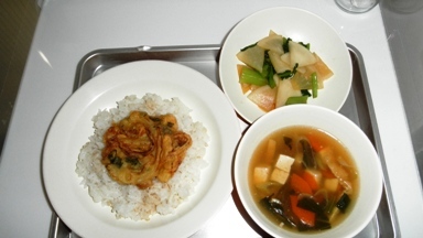 かき揚げ丼、豆腐汁、かぶのレモンしょうゆかけ、牛乳