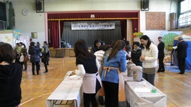 第7ブロックの各校PTAによる研修フェアに向けて、朝早くから準備されていました。体育館の室温は13度を下回ります。屋内で13度はかなり寒く感じる温度です。瀬田小のブースだけでなく会場校として全体をコーディネートしていきます。