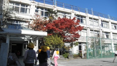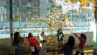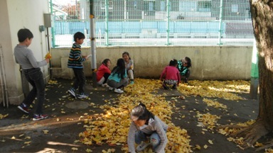 色づいたイチョウの落ち葉とサクラの落ち葉は、子どもたちの興味を十分引きつけます。落ち葉がたまるところには、子どもたちが集まっていました。聞くと授業で落ち葉を使うのだそうです。