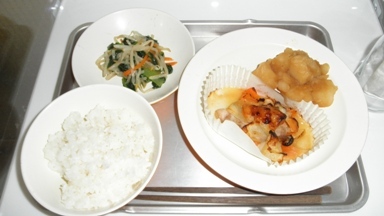 ご飯、鶏肉の味噌野菜焼き、ジャガイモの甘辛煮、おひたし、牛乳
