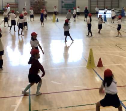 体育館で体育をしました。ボールを友達にパスしたり、コーンにボールを当てるゲームをしたりと、楽しく体を動かしました。