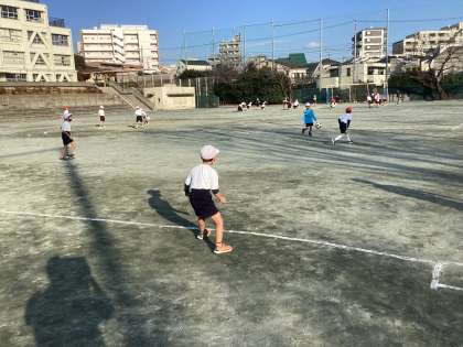 2年生の体育では、跳び箱とボール蹴り、縄跳びをやっています。本日は、瀬田中のグランドでボール蹴りを行い、ボールの止め方や蹴り方など工夫して、楽しみました。