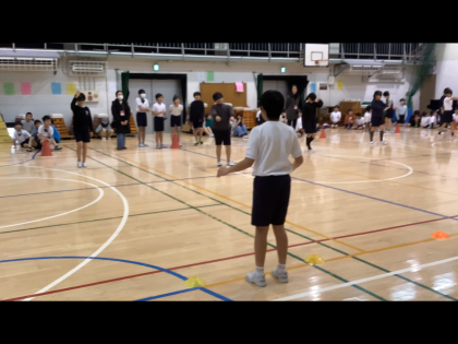 「笑顔と学びのプログラム」では、講師の方に来ていただき、ブラインドサッカーをしました。活動を通して、「目隠しをして歩くことの大変さ」を知り、さらに「ガイドの大切さ」について学びました。総合的な学習の時間の学習につなげていきます。