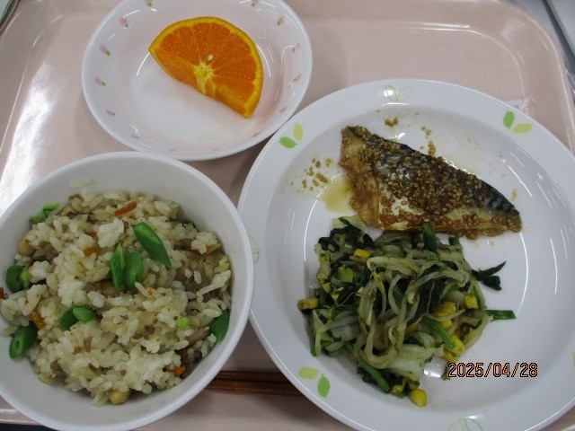 まめとれんこんのごはん・さばのごまだれやき・いそあえ・オレンジ・牛乳