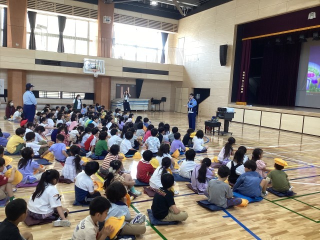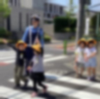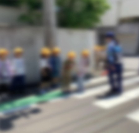 玉川警察署の方をお呼びして、交通安全教室を行いました。「止まる・見る・待つ」の三つの約束を確認しました。模型の信号機・横断歩道での歩行練習後、実際の横断歩道で歩く練習も行いました。