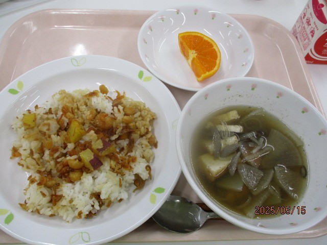 エビと大豆のバラ天丼・けんちん汁・マンダリンオレンジ・牛乳