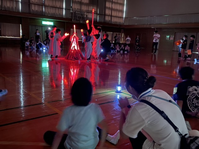 体育館で、9校の子どもたちが集まり、キャンドルファイヤーをしました。