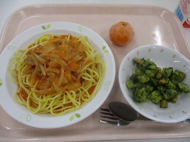 トマトパスタ・青のりポテトビーンズ・冷凍みかん・牛乳