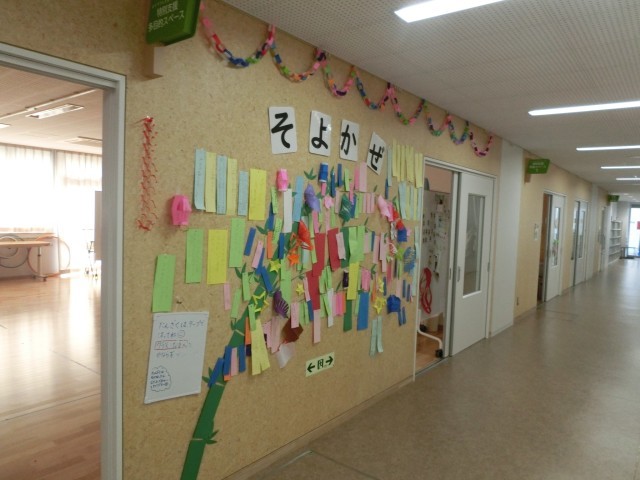 そよかぜ学級前の笹が、笹かざりでいっぱいになりました。