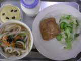 関西風もちきつねうどん 牛乳 野菜のゆず塩かけ ミニ甘納豆入り蒸しパン ☆今日...
