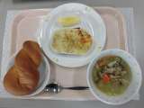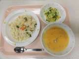 [献立] シーフードピラフ 牛乳 キャロットポタージュ キャベツとほうれん草の...