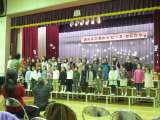 上 コンサートの開催を待つ子どもたち 下 プログラム1番「みんなで歌おう」 童謡...