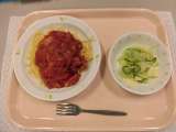 [献立] スパゲッティ地中海ソース 牛乳 りんご入りサラダ [食材] 玉ね...