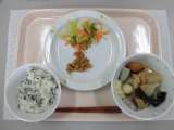 [献立] わかめごはん 牛乳 おでん 大豆とじゃこの甘辛揚げ 即席漬け [食...