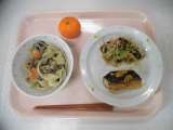 [献立] ごはん 牛乳 家常豆腐 白菜の中華サラダ くだもの(柑橘:はれひめ)...