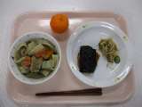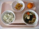 【献立】 青菜ごはん 牛乳 おでん 白菜のおかかかけ くだもの(ぽんかん) ...