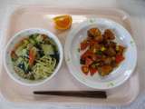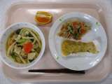 【献立】 ミルクパン 牛乳 鶏肉のマーマレードソース 野菜スープ わかめスパゲ...
