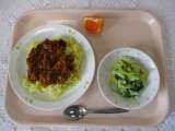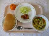 【献立】 レンズ豆入りドライカレー 牛乳 キャベツとほうれん草のサラダ くだも...