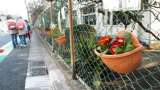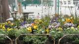正門側のフェンスには、春の花が咲いた鉢があり、通行する人の目を楽しませてくれま...