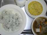 わかめご飯 牛乳 けんちん汁 卵焼き ☆今日は卵焼きでした。豚挽肉、えび、たけ...