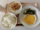 今日の献立は、ご飯・牛乳・卵焼き・野菜のおかかかけ・じゃがいもの甘辛煮です。
