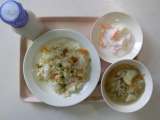 4月19日の献立は、三色ピラフ・牛乳・ベーコンと野菜のスープ・フルーツヨーグルト...