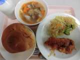 今日の献立は、チャーハン・牛乳・ラーパーツァイ・わかめスープ・リンゴゼリーです。