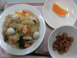 今日の献立は、中華丼・牛乳・大豆とじゃこの甘辛あげ・清見オレンジです。