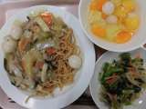 【献立】 五目あんかけ焼きそば 牛乳 ナムル フルーツ白玉 【食材産地】 豚肉...