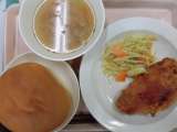 今日の給食は、マーガリンパン・牛乳・鯵のフライ・野菜のカレードレッシング・コンソ...