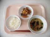 [献立] ごはん 牛乳 かつおと大豆のみそがらめ 沢煮椀 [食材] 米:山...