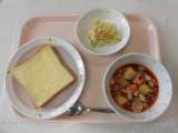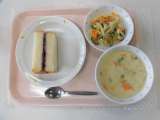 [献立] ブルーベリージャムサンド 牛乳 コーンシチュー 野菜のイタリアンドレ...