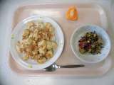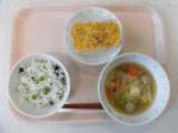 [献立] グリンピースとわかめのごはん 牛乳 切干大根の卵焼き とびうおのつみ...