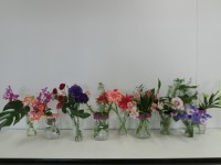 3年生の図工の授業では、本物のお花を見て絵を描いています。色とりどりの花を見る子...