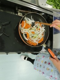 6年生は家庭科の調理実習で野菜炒めを作りました。野菜の大きさをそろえ、炒めていま...