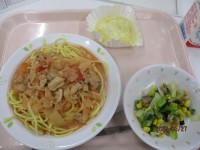 スパゲッティトマトクリームソース・小松菜とベーコンのサラダ・リンゴ蒸しパン・牛乳