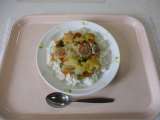 【献立】 チキンライス 牛乳 マセドアンサラダ 【食材】 米:山形県 玉ね...