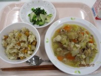 カレーピラフ・かきたまスープ・キャラメルポテト・牛乳