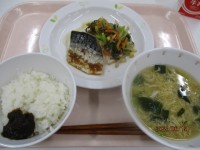 有機米・さばの韓国風焼き・ごまあえ・かきたまじる・牛乳・手作り海苔の佃煮