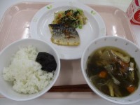 有機米ごはん・さばの韓国風焼き・ごまあえ・五目汁・手作りのりの佃煮・牛乳